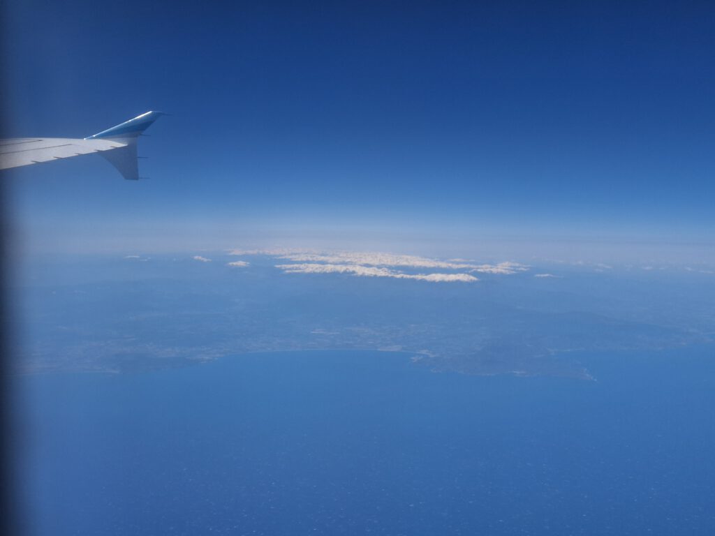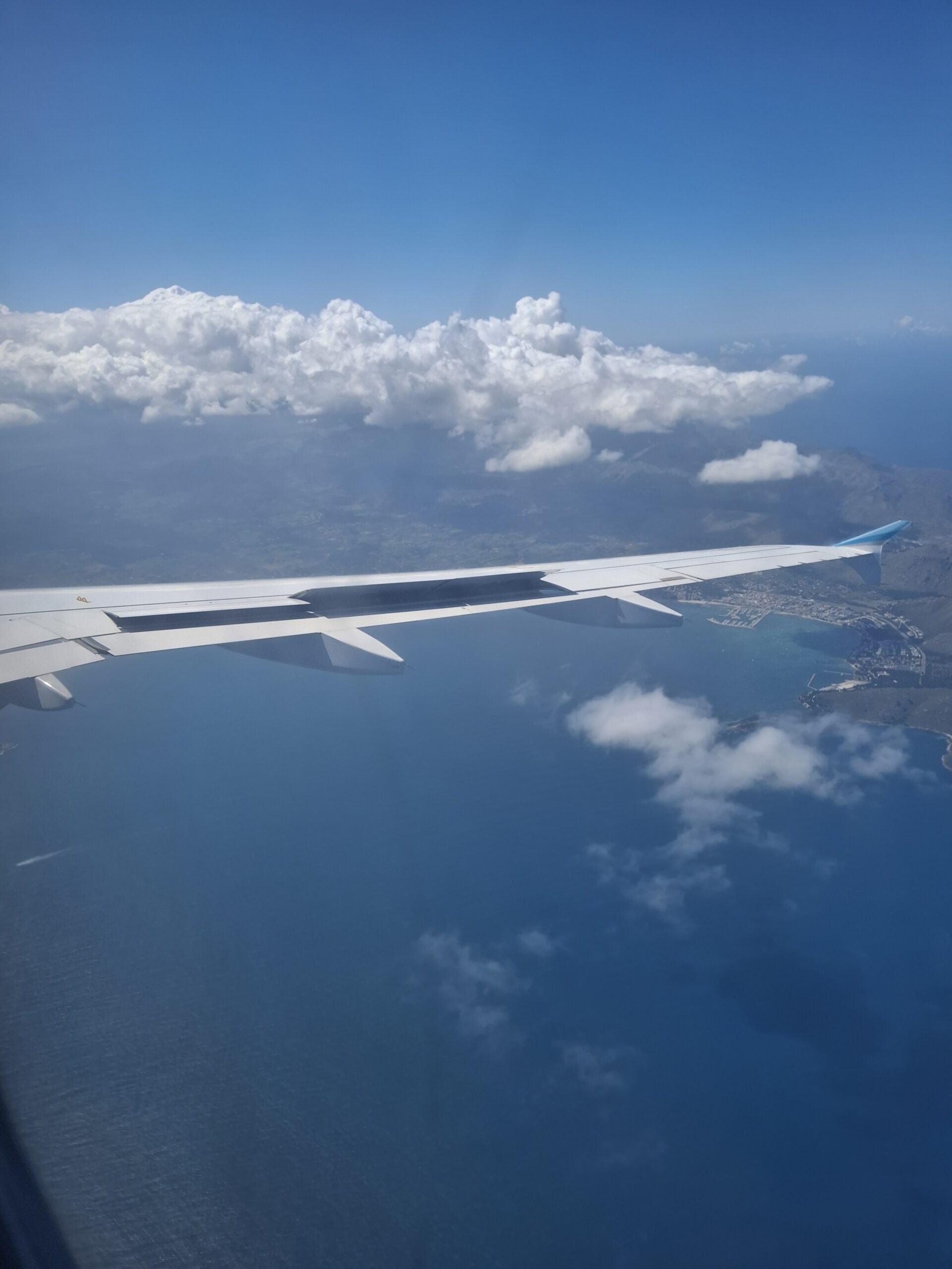 Nach Kofferaufgabe, langer Wartezeit danach mit Frühstück, zügiger Sicherheitskontrolle und weiterer langer Wartezeit am Gate B30 ging es fast pünktlich auf dem Rollfeld hoch in die Luft. Die Maschine war zu fast 100% ausgebucht, bis auf viel Säuglingsgeschrei war der Flug aber gut, sonnig bis auf den Überflug von Mallorca selber. Dort erwartete uns eine heftige Regenfront. Besonders beeindruckt hat mich die Sicht auf die Pyrenäen, die sich schneebedeckt aus der grün/braunen Landschaft erhoben.