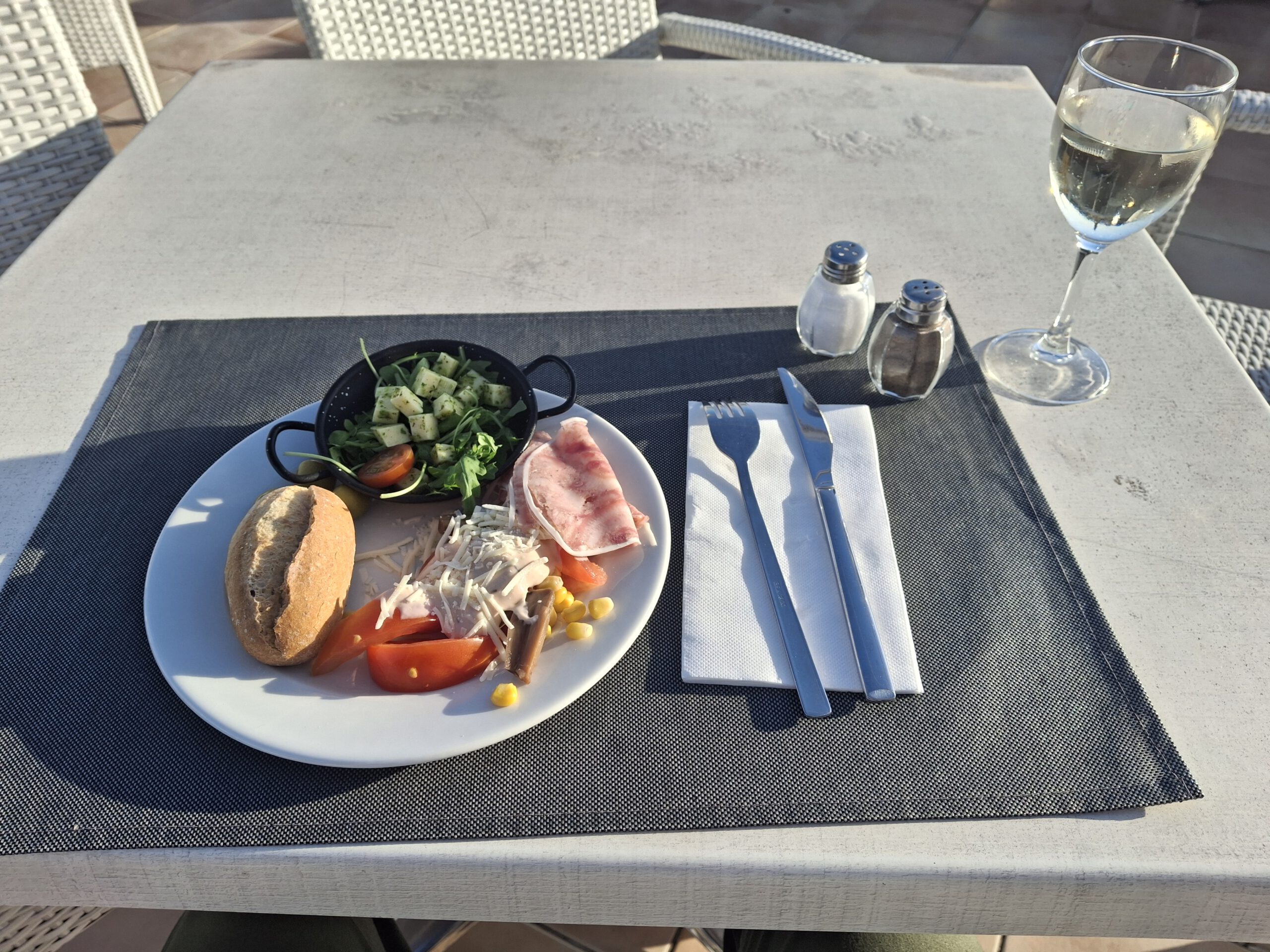Zwei all inklusive Bierchen an der Bar und dann einrichten im Zimmer. Abendessen ist von 19:00 – 21:00, das Buffet nicht besonders groß, aber mit guter Auswahl und einigen spanischen Gerichten. Lecker wars, ein paar Getränke noch, ein kurzer Abendspaziergang um den Block und dann um 22:00 sehr müde ab ins Bett.