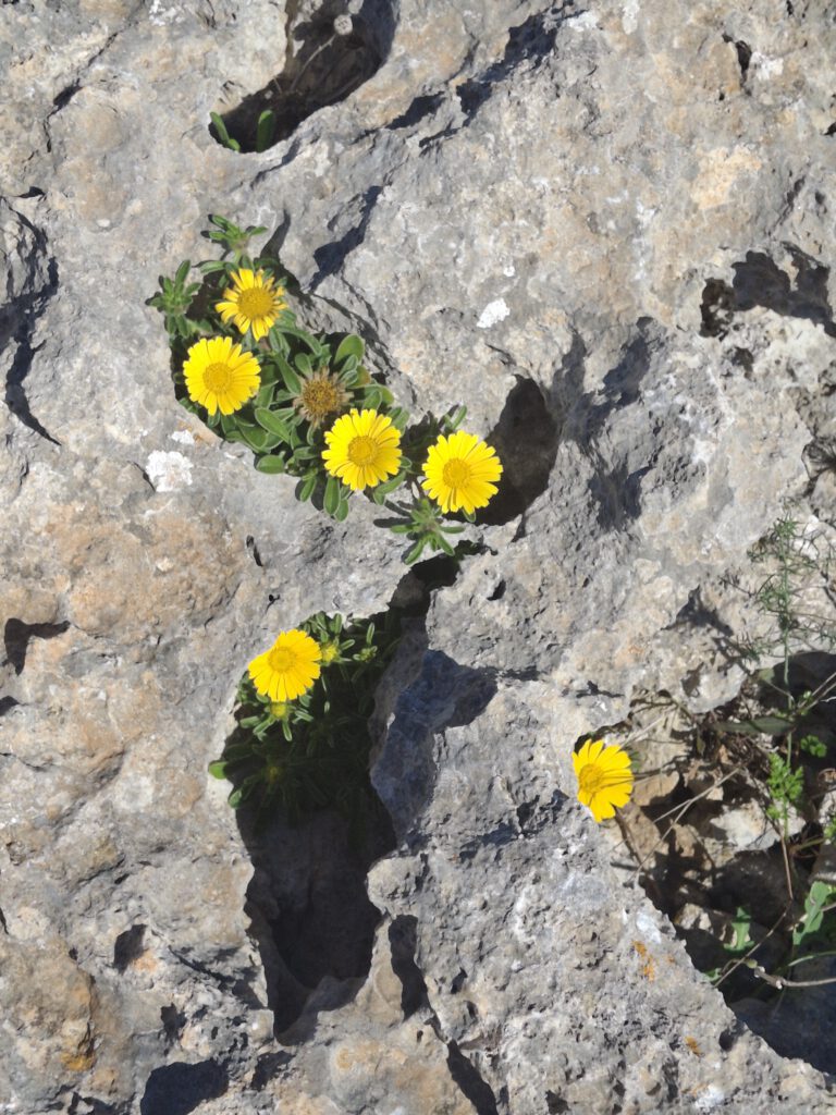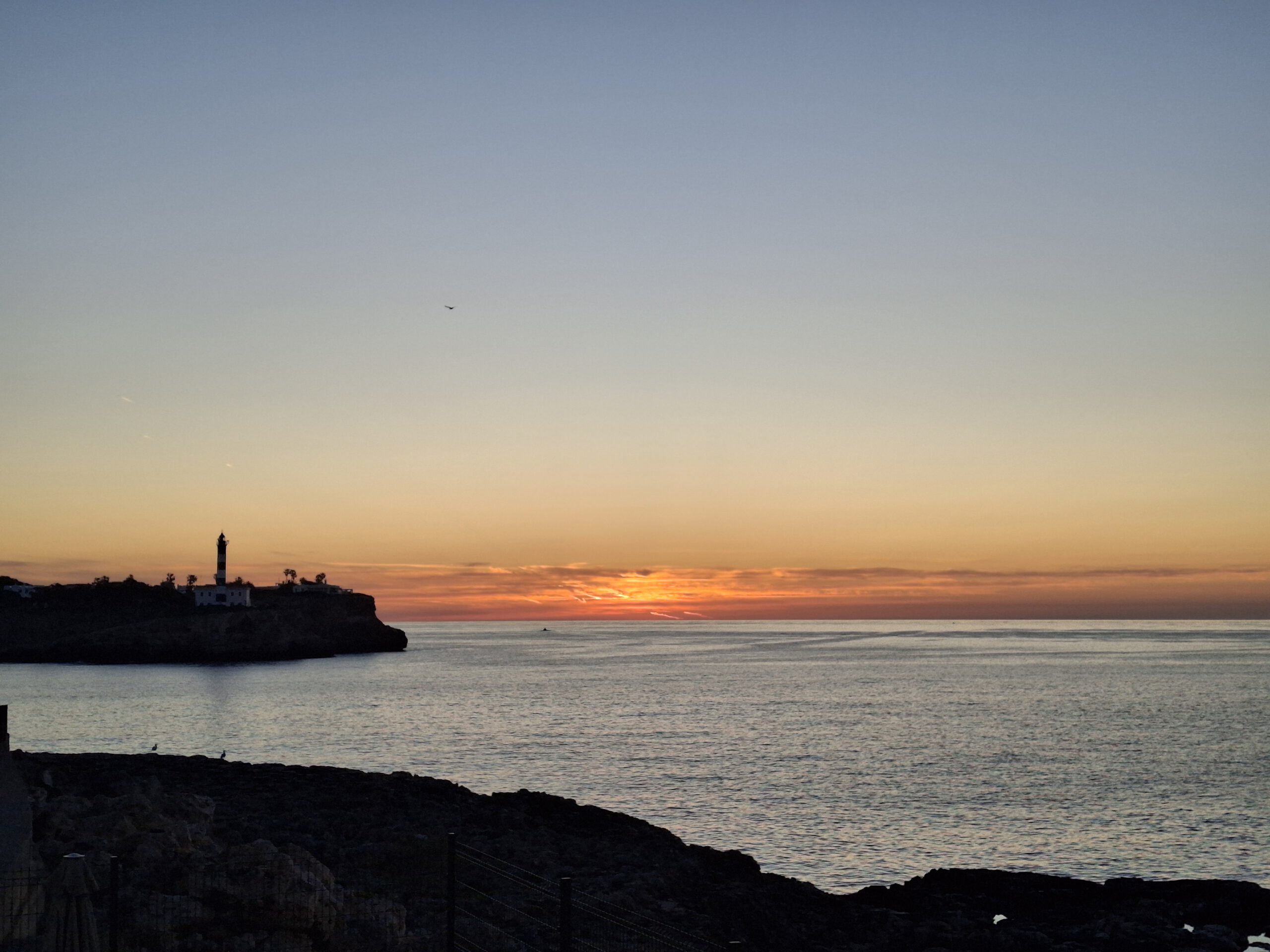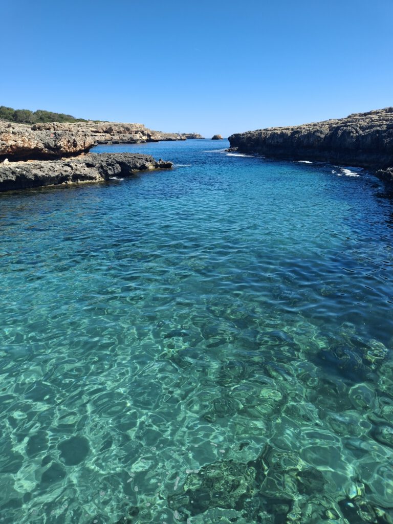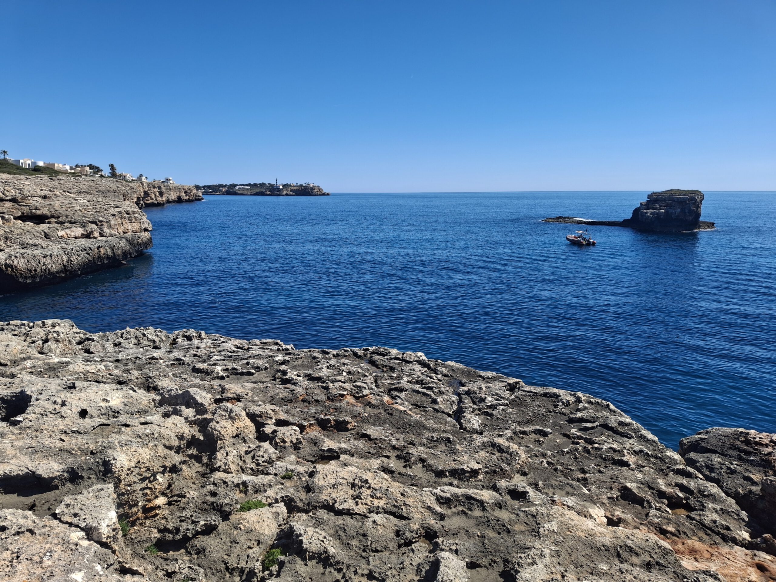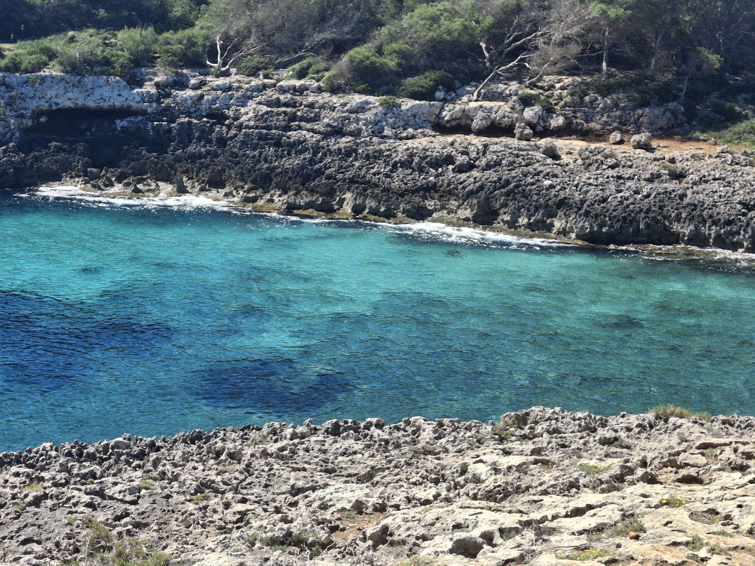 Als ich die Bebauung durchquert hatte, wanderte ich zur Küste hinunter und es ging auf Singletrails, wie es so schön bei Komoot heißt, weiter bis ich schließlich den Wendepunkt in der Cala sa Nau erreicht hatte. Zuvor passierte ich einige völlig einsame Buchte, bei denen die Felsen allerdings bis ins Meer reichten, also kein Sandstrand ist. Die Felsen scheinen vulkanischen Ursprungs zu sein, sehr löchrig, porös und scharfkantig. Ziemlich nett hier.