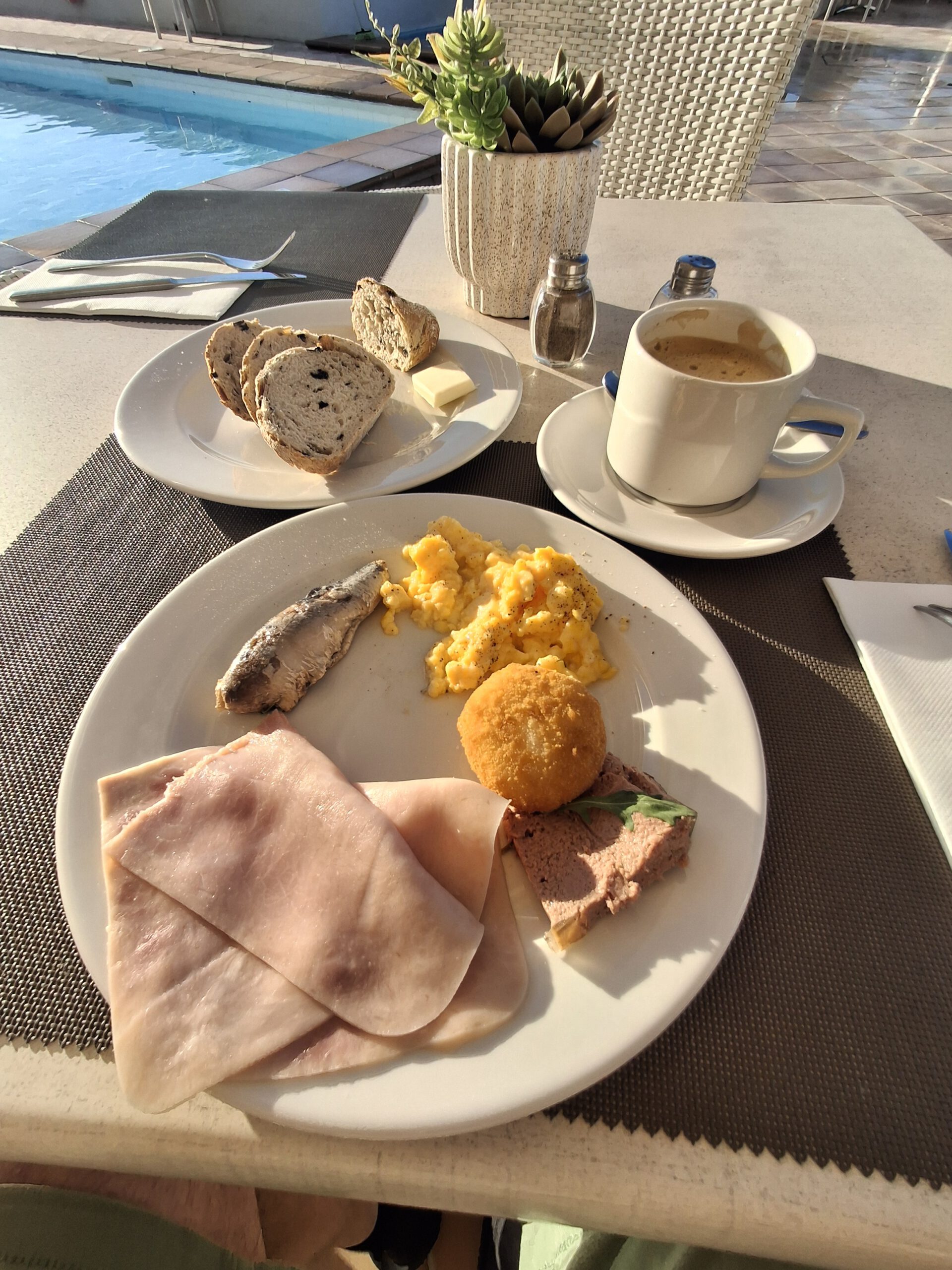 Schon 15 Minuten vor der Frühstückszeit setzte ich mich schon auf die Terrasse und warte auf den ersten warmen Kaffee. Meist schaffe ich 2 Sudokus und dann geht die Türe auf, endlich Kaffee und leckeres Frühstück.