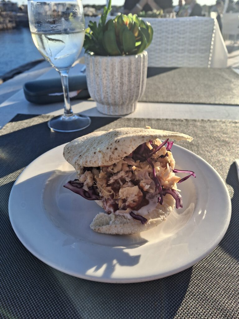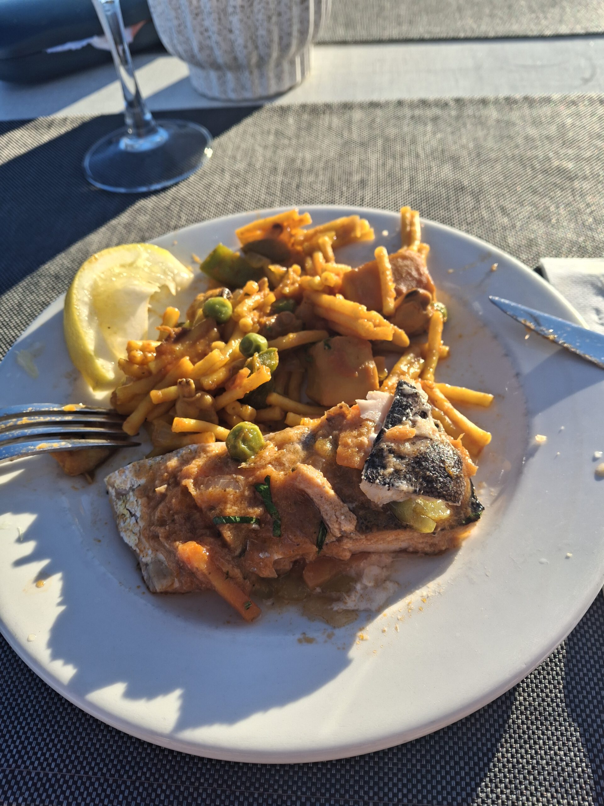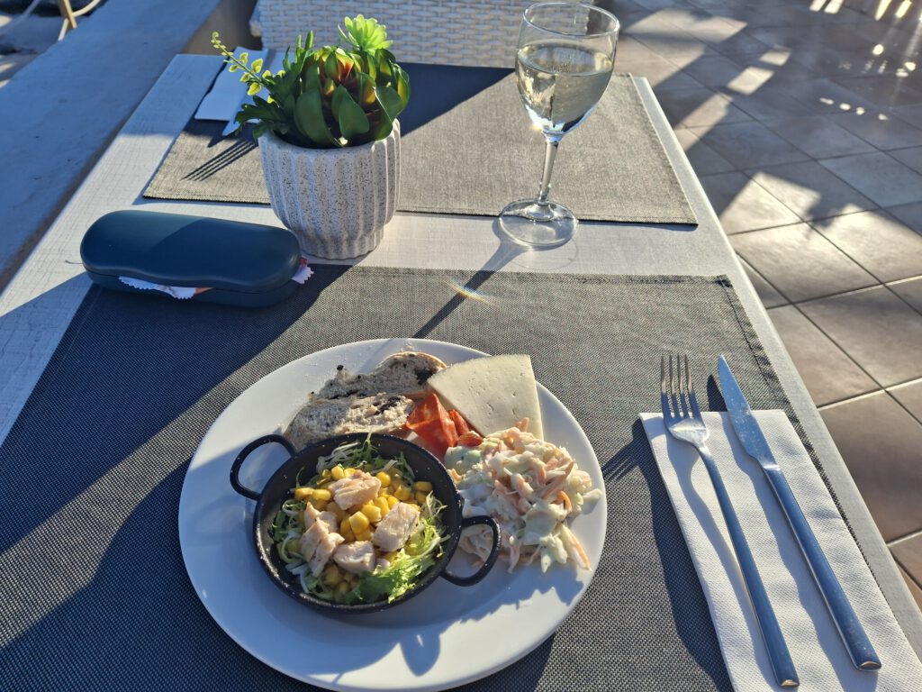 Ohne eine großartige Pause trat ich in der kleinen Sandbucht Cala sa Nau den Rückweg an und erreichte das Hotel nach insgesamt etwa 4 Stunden wieder. Dort dann etwas rum-lümmeln im Zimmer, den Bericht hier von gestern unten in der Lobby schreiben, duschen, mit Jutta telefonieren und aufs Abendessen warten! 😉 Das war wie immer lecker und abwechslungsreich.