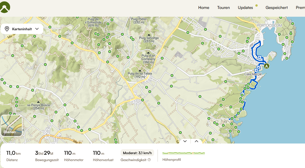 Dann ging ich zu einem Radverleiher in Portocolom, den ich gestern im Internet gefunden habe, der ist Fuß läufig erreichbar, hat wohl auch Rennräder und annehmbare Preise. Wir vereinbarten, dass ich morgen früh komme und das Rad dann abholen kann. Also wieder zurück zum Hotel, umziehen und dann los zur geplanten Wanderung.